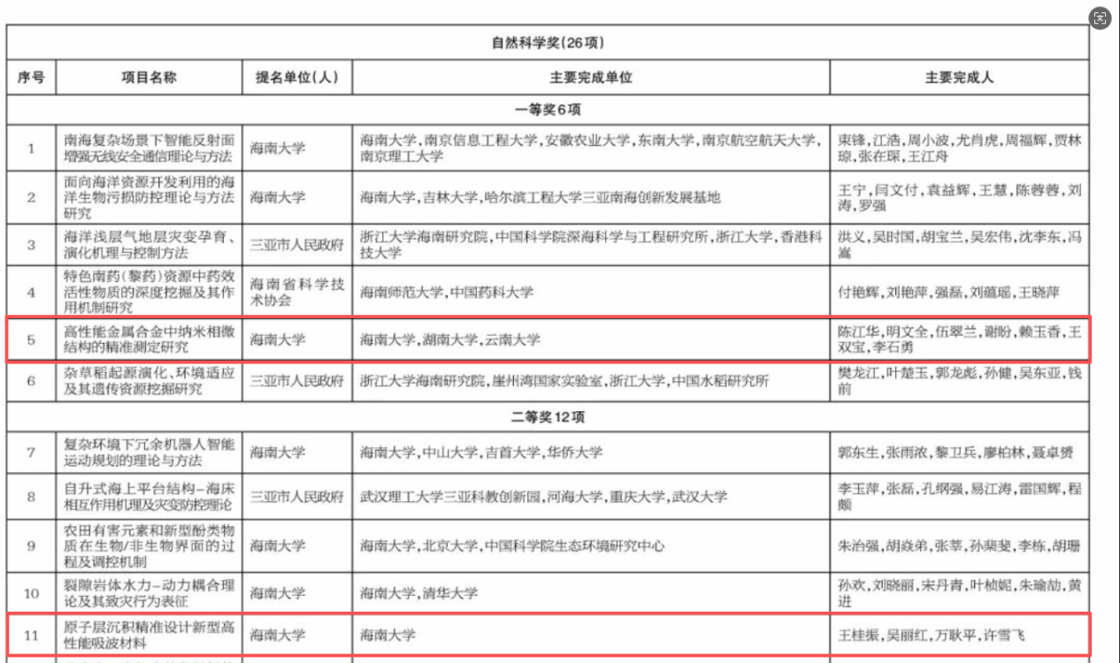 其中,“高性能金属合金中纳米相微结构的精准测定研究”项目荣获海南省自然科学奖一等奖。该项目成果由陈江华教授领衔,联合湖南大学、云南大学共同完成,在纳米相微结构精准测定方法上取得重要突破,为高性能金属材料设计与优化提供了关键支撑。同时,“原子层沉积精准设计新型高性能吸波材料”项目荣获海南省自然科学奖二等奖。该项目成果由王桂振研究员领衔完成,在新型吸波材料的结构设计与性能调控方面具有重要创新价值。